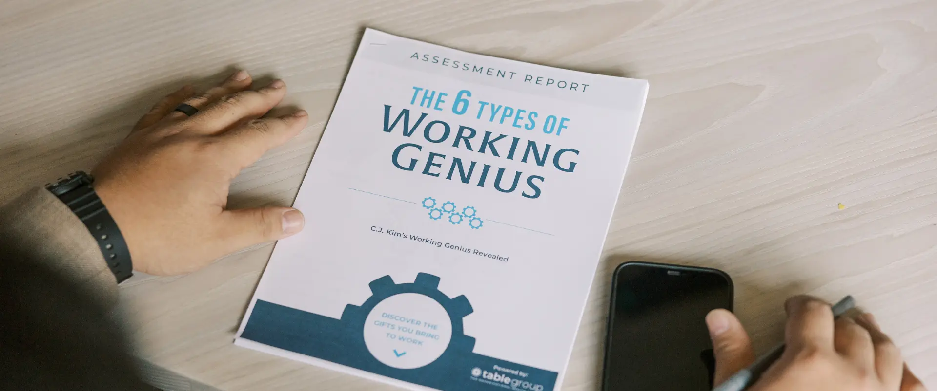 The Working Genius assessment is a ten-minute inventory of your natural giftings and motivators across the 6 core categories of how all work gets done.