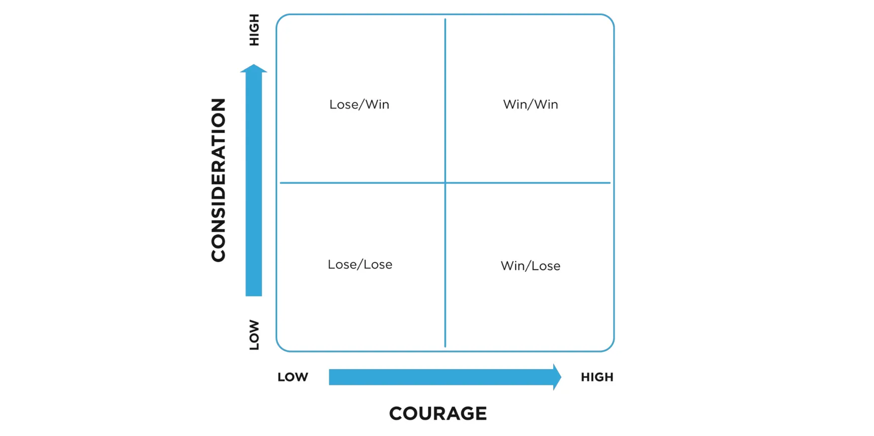 The paradigms placed in the 2X2 matrix above challenge us in the scenarios we face along a continuum of consideration and courage. Win/Win or No Deal is the highest form of consideration and courage.